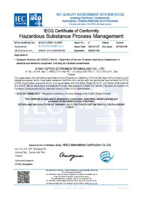 本公司通過ISO 9001 品質管理系統、ISO 14001 環境管理系統及IECQ QC 080000 有害物質流程管理系統的流程規範,我們將遵守各項品質管制要求及產品標準,以達成客戶滿意目標。